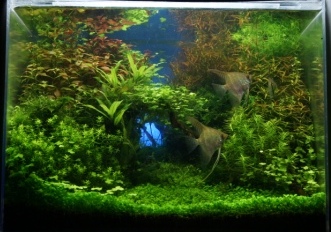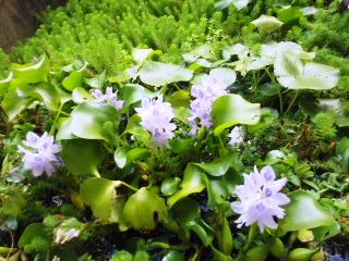いっぱいになった水上水草たちを熱帯魚と
