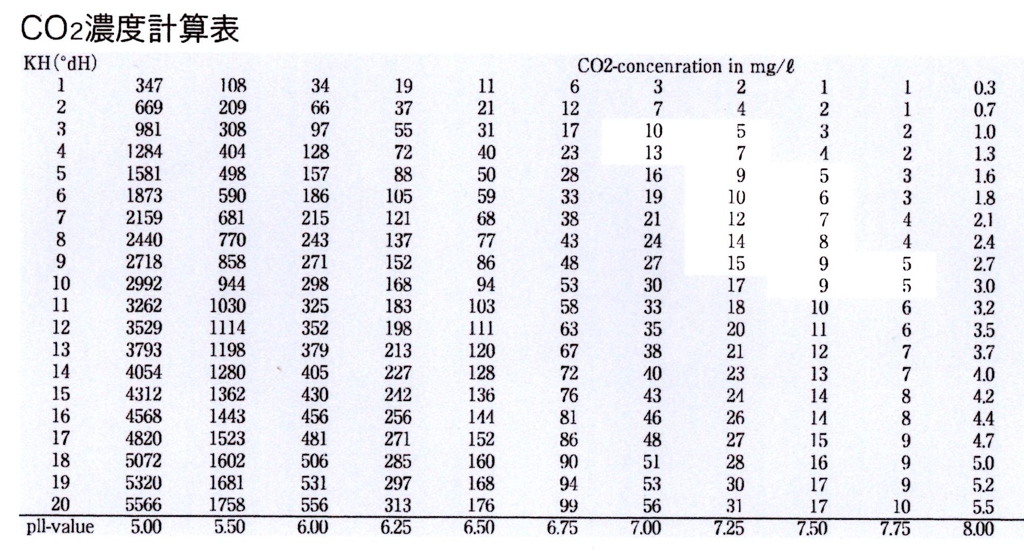 テトラ 二酸化炭素濃度計算表 かなり画像悪いので読めないかな?